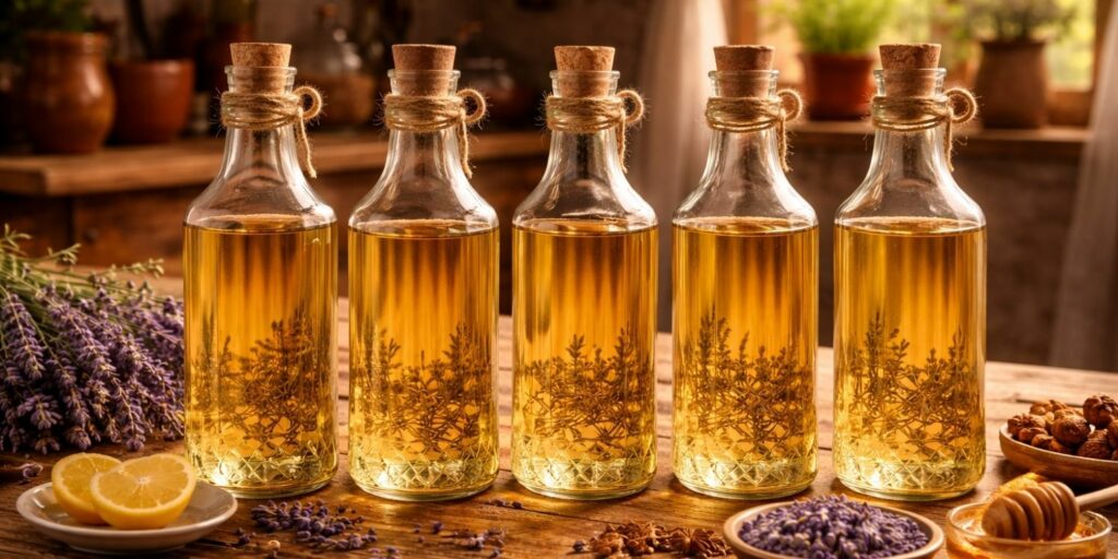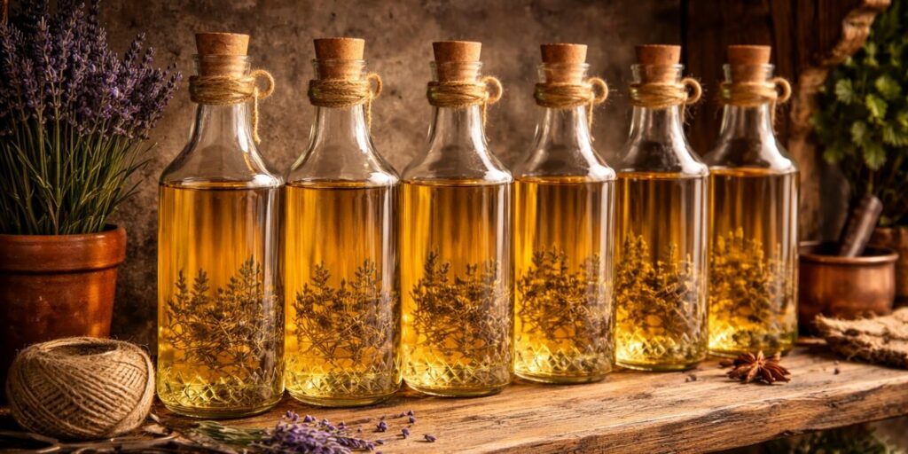 - Lavande & vanille : 1/2 gousse dans l’alcool 3–5 jours, puis filtrage.