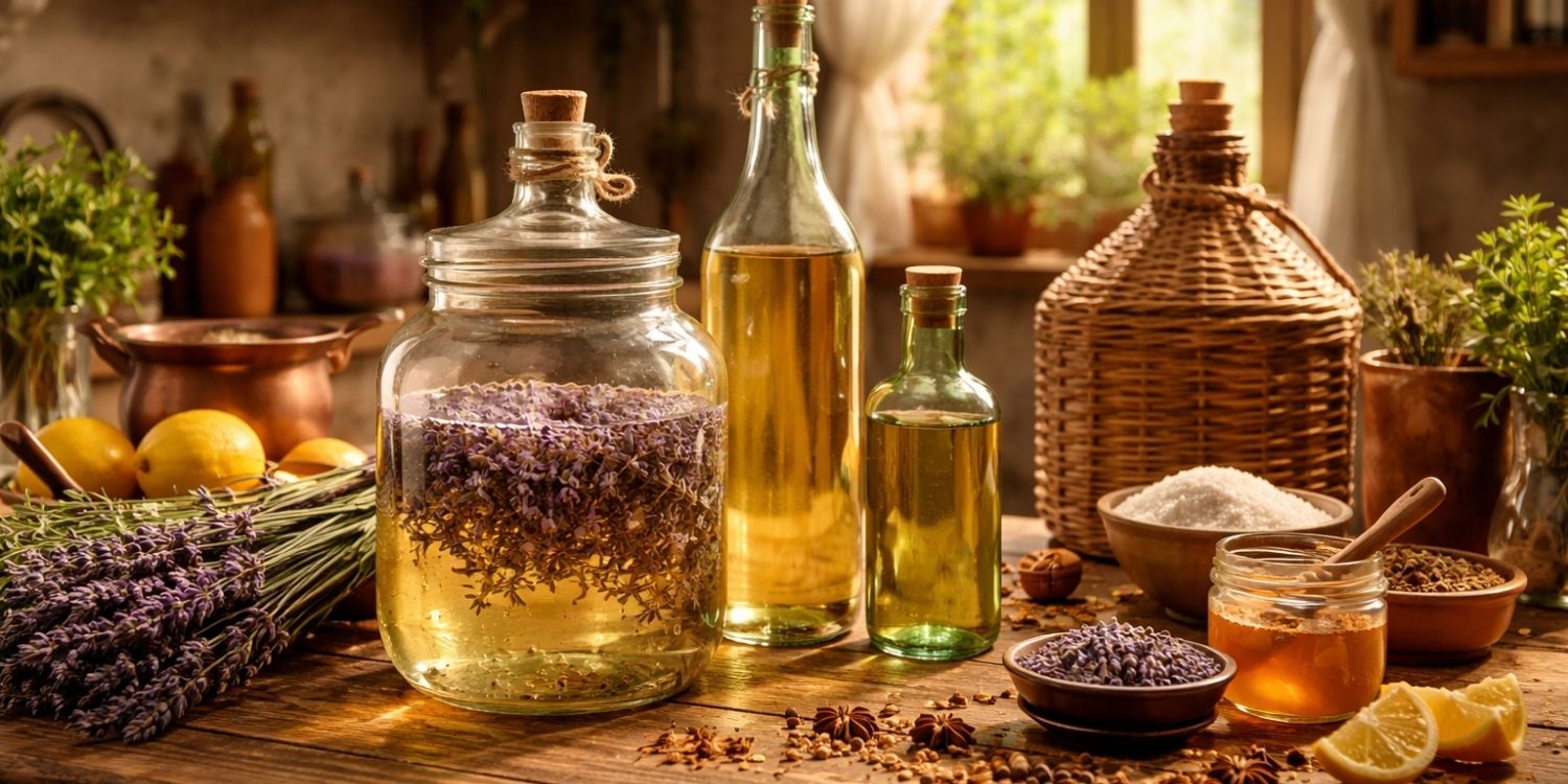 La logique est simple : macération → filtration → sirop → assemblage → repos. Le diable se cache dans les détails : dosage de lavande, durée, et filtrage fin.
